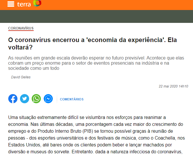“O coronavírus encerrou a ‘economia da experiência’” é matéria publicada no The New York Times e traduzida no Brasil. David Gelles comenta que eventos que reúnem pessoas foram responsáveis por forte criação de empregos nos últimos anos; agora, serão os últimos a retornar.