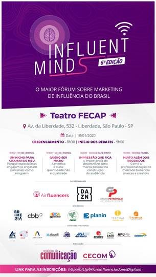 A plataforma Negócios da Comunicação e o CECOM – Centro de Estudos da Comunicação anunciam a 6ª edição do Influent Minds – Fórum de Marketing de Influência. O evento gratuito acontece no dia 18 de janeiro de 2020, das 9h às 16h30, no Teatro Fecap, em São Paulo, e traz três painéis e uma sessão de bate-papo sobre estratégias de engajamento e comunicação desse tipo de influenciador digital. A Aberje é apoiadora da iniciativa.