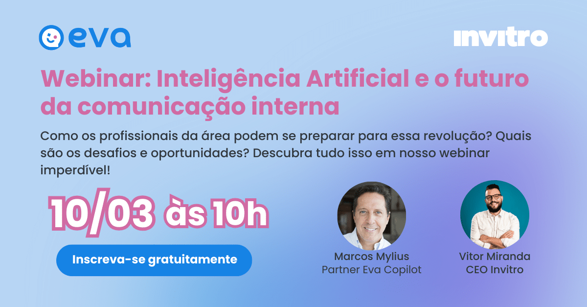 O evento acontece no dia 10 de março, às 10h, e contará com Marcos Mylius, Partner na Eva Copilot, e Vitor Miranda, CEO da Invitro, especialista em Comunicação Interna há 15 anos.